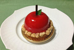タルト生地の上にリンゴ味のムースを丸く乗せ、赤いジュレでその周りを固めたもの。